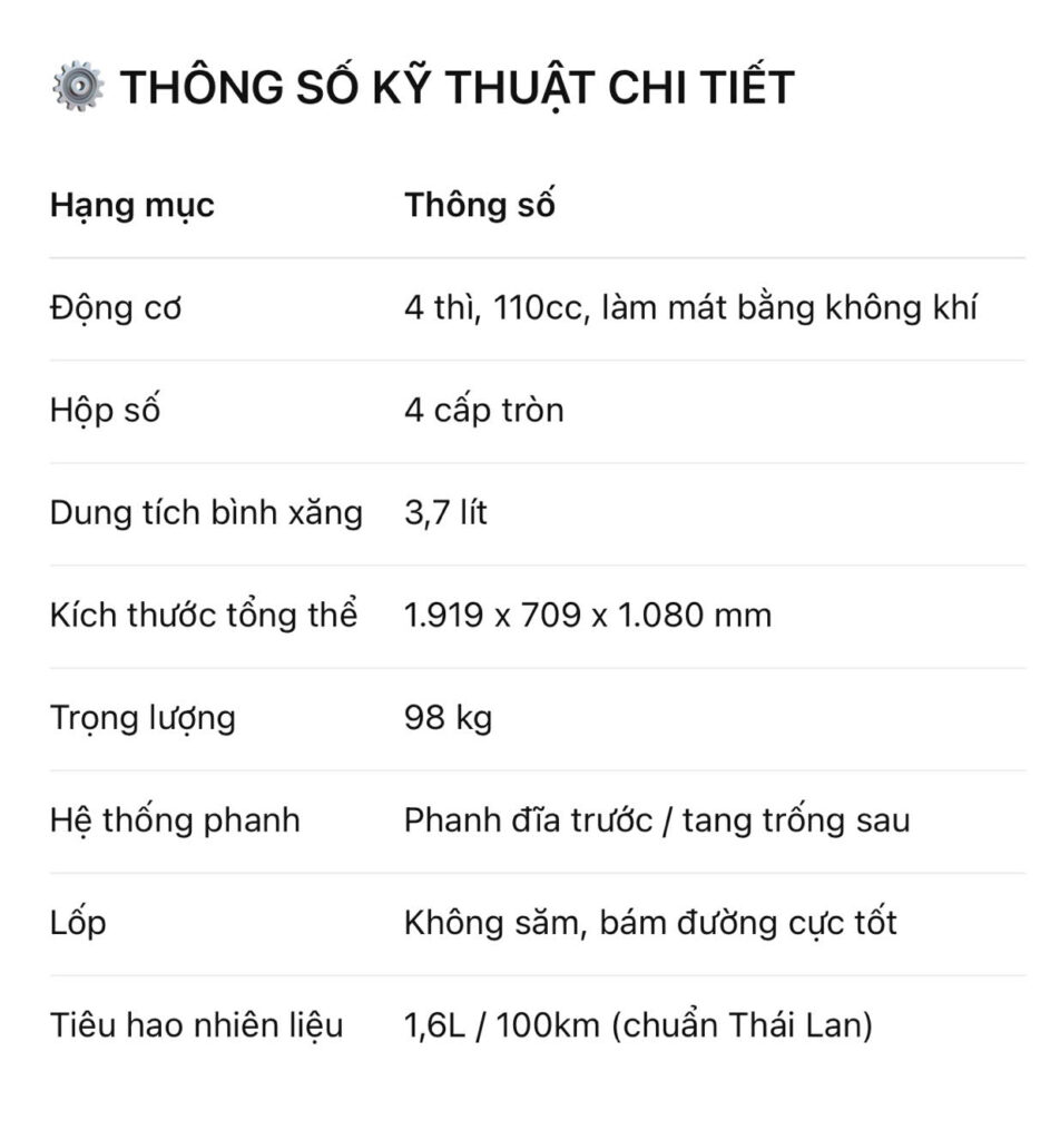 • ✅ Động cơ 110cc siêu tiết kiệm xăng, vận hành mạnh mẽ và êm ái.